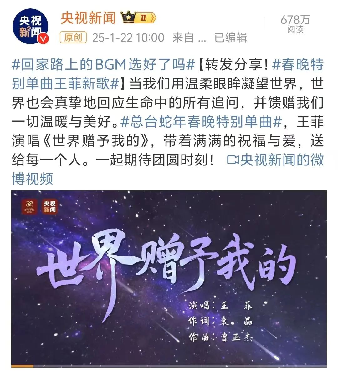 1月22日,微博@央视新闻 官宣