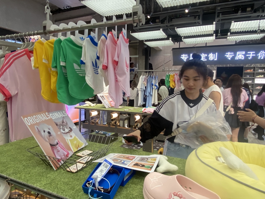 同时,为了满足年轻消费者对潮流尖货、个性化体验的追求,店内汇聚了三叶草系列尖货和众多首发新品。其中,包括宠物短袖、项圈以及仿皮宠物包等产品在内的三叶草宠物系列,为全球首发。“三叶草宠物系列由阿迪达斯上海创意中心设计,5月20日在新店首发后,27日后才会陆续出现在其他门店和线上。”卢震瀚告诉记者,除了这一份“独一无二”,三叶草全球旗舰店的上新频率也从“月更”变为“周更”。
