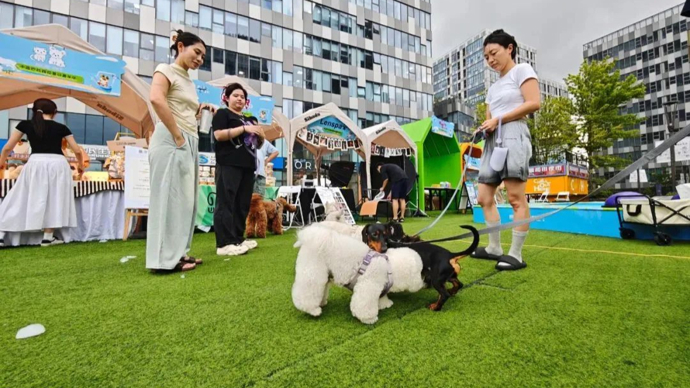 复悦荟商圈的户外广场上,几只金毛正追着飞盘跑,毛孩子吐着舌头,主人坐在遮阳伞下,看它们撒欢。内街的宠物店里,美容师正给泰迪修毛,剪刀声和狗狗的哼唧声混成一片;零食店的货架上,猫罐头、狗咬胶摆得五颜六色。