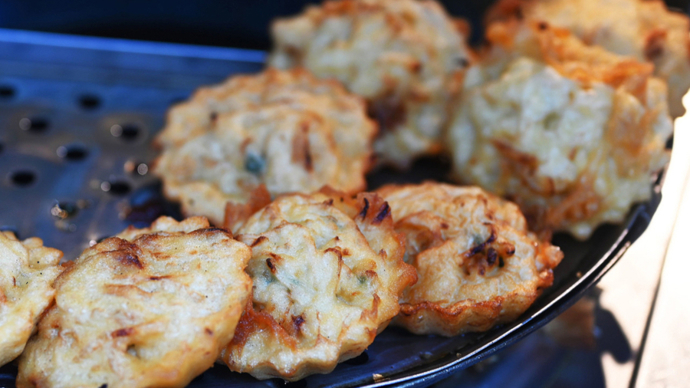 这种从油锅里刚捞上来就往嘴里送的面食,烫破嘴皮、烫得天花板起泡是常有的事。所以,待寒风起,尤其是嗖嗖冷风直往脖子里灌的冬日,吃油墩子才是最应景的。它的馅料有好几种,最热卖的是加了葱花的萝卜丝,还有豆沙馅的和鲜肉馅的。我家有一个网购的小模具,自制的油墩子是咸口的,在萝卜丝里多加了一点虾皮和黑木耳,吃起来特别鲜。