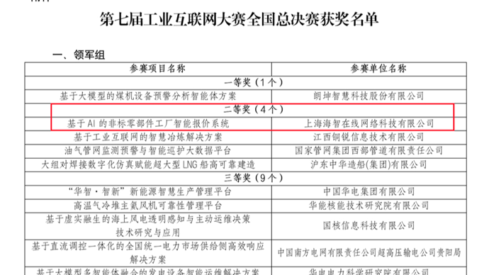 近日,由国家工业信息安全发展研究中心主办的第七届全国工业互联网大赛总决赛在北京圆满收官。来自上海的企业“海智在线”凭借其项目《基于AI的非标零部件工厂智能报价系统》,在竞争激烈的“领军组”中脱颖而出,荣获二等奖——该奖项仅设四个席位,而海智在线以总分第二的成绩登榜。