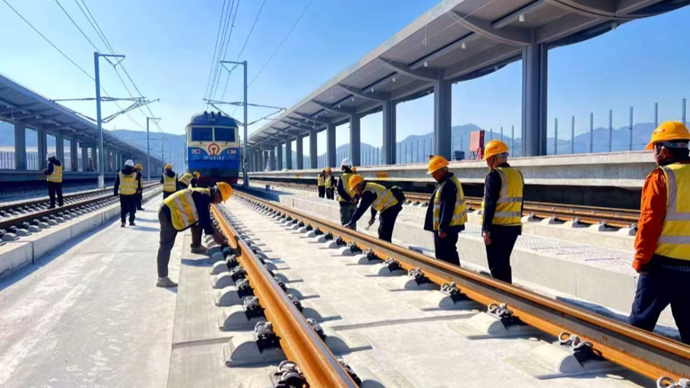 施工人员正对温岭西站已铺设的钢轨进行细致巡检。