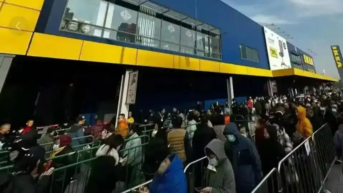 社交媒体上的视频显示,近日,宜家宁波店门口的马路上堵车几百米,南通店门口的人在冷风中大排长队,哈尔滨店购物车堵成一团,甚至有顾客为了某个商品发生争执,屏幕外还传来“这辈子没见过宜家这么多人”的声音。