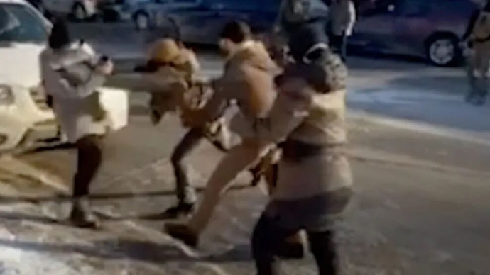 几名执法人员抓住手里还拿着手机的普雷蒂,其他执法人员走上前去,试图将普雷蒂按倒在地。