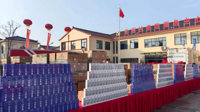 记者在现场看到,上千部AI大屏手机已经垒成一面墙,刘强东为乡亲们准备的年货堆得比人还高,堪称“最有排面的年货”。村民已在现场排起长队准备领取年货。