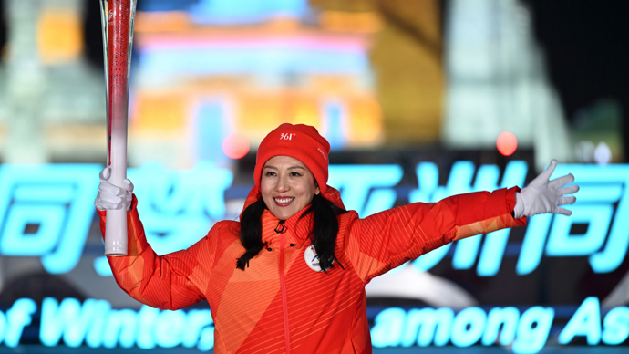 2月7日,第一棒火炬手杨扬在火炬传递现场挥手致意。