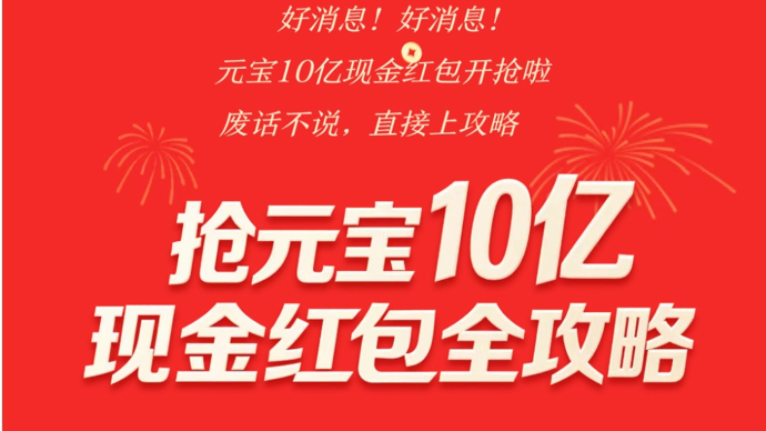 1月25日,腾讯官方发布《关于春节分10亿现金的通知》,自2月1日起,用户将元宝APP更新到最新的2.55.0以上版本,点击主页的预约卡片进入春节会场预约页面,可额外获得10次抽奖次数,单个红包金额可达万元。