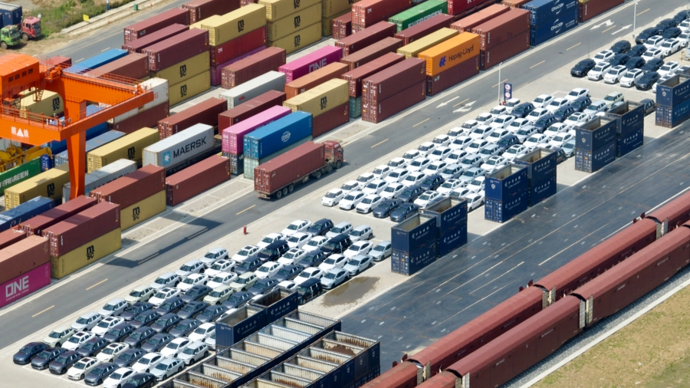 合肥派河港铁路物流基地拍摄的等待装车出口的新能源汽车 图片来源:新华社