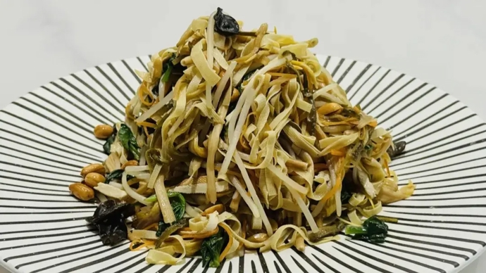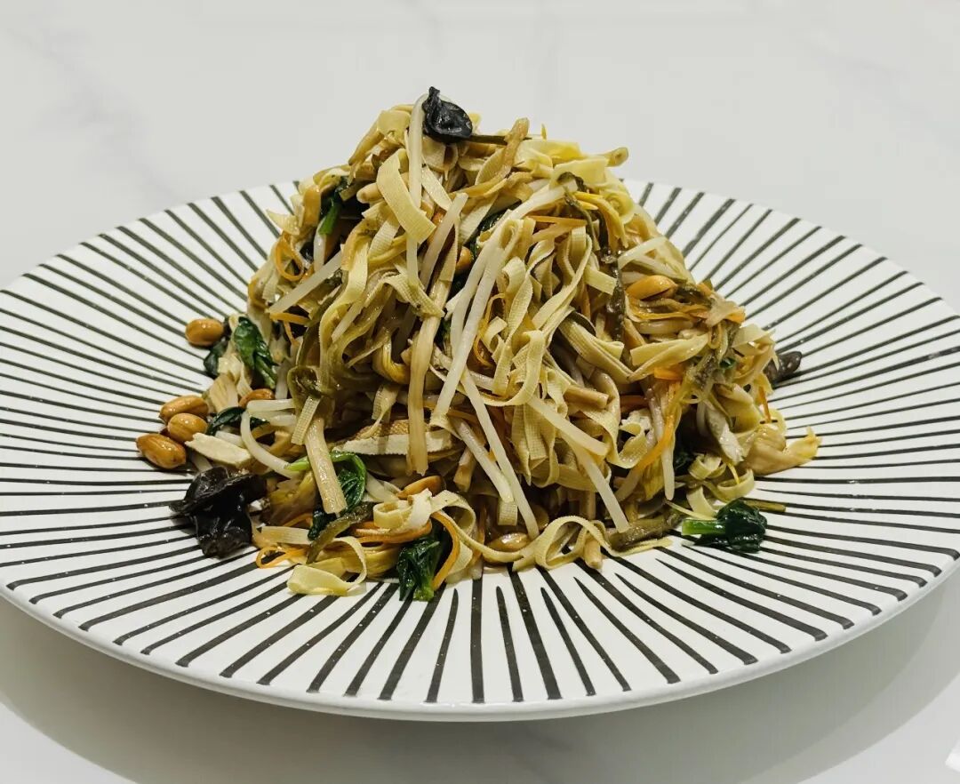 陈建明大师的这道“六一丝”也许受到“十香菜”的启发,如果那年张大千71岁,大概就是“七一丝”了。从历史上看,中国各帮各派的有些菜就是在相互借鉴中臻于完善的。去年夏天我用芹菜、茭白、黄豆芽、紫甘蓝、荷兰豆、胡萝卜、油豆腐等八种纯素食材,汆熟后下糟卤稍加浸渍,做成一款“醉八仙”,可配二米粥,也可做冷面浇头。