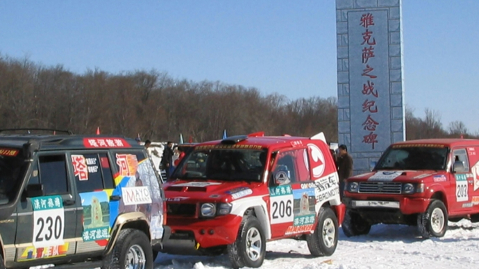 4月1日,我搭着王裁判长的车前往,将近下午一点,前方出现一座碑,赛段起点到了。那里冰雪铲尽,不少地方裸出河床上大大小小的鹅卵石。三级木头台阶上的碑,约4米多高1米多宽。细看是木头碑,四周钉喷绘布,淡天蓝色的花岗岩图案上印着字。正面红色新魏碑体:雅克萨之战纪念碑。背面文字是那场战斗简述。漠河县委宣传部徐副部长告诉我:原碑在下游10多里处,早就没了,现准备重建。其实,有没有碑并不重要,只要书中记着,心里不忘。