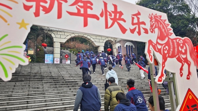 “前几年开学出操,我们发现初三年级不在,就打听到有这个活动,一直很期待,今年终于到我们了!”男生小陈想了一想,用两个字形容这种“仪式感”。“传承!”政教处主任袁宇飞介绍,学校已经连续4年组织这个活动,今年恰逢红军长征胜利90周年,因此,老师们特意设计了背诵《七律·长征》、长征知识问答、合作拼搭“人形五角星”等三个打卡任务,同学们须在登山过程中以小组为单位完成,也让大家感受到,登山虽然辛苦,但一路有伙伴同行。