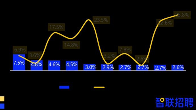 求职端热度与需求侧高度呼应,汽车智能互联行业求职人数同比激增168.9%,光电子、机器人及新材料行业增速均近或超百倍,显示新质产业对人才吸引力显著提升。此外,汽车后市场、养老/看护、在线生活服务(O2O)等行业的求职热度也同步攀升,求职人数同比增速均超60%,反映出服务消费领域的就业吸引力稳步增长。
