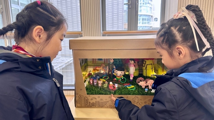 二(7)班曾允桐小组搭建的作品是《大头儿子和小头爸爸》,挑选了书中《毛叔的“圈套”》这个故事来设计场景,因为套圈这个游戏很多同学都玩过,而且故事中“小头爸爸”陪着“大头儿子”一次次练习套圈,满满的爱和有趣的互动,特别动人。曾允桐捏的“围裙妈妈”太高,重心不稳老是倒,爸爸想出了妙招,顺手把附赠的彩泥工具嵌入“围裙妈妈”的身体,搞定!“就像‘小头爸爸’不放弃帮‘大头儿子’套圈一样,我们设计时遇到小问题也一起想办法解决。”曾允桐说,就像故事里的一家三口一样,在制作“故事纸箱”的过程中,她也享受着和爸爸妈妈一起分享故事、一起玩耍的快乐。