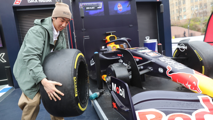 现场有1:1半车身F1换胎模拟器,日本友人在亲身体验掐秒换胎的紧张刺激。
