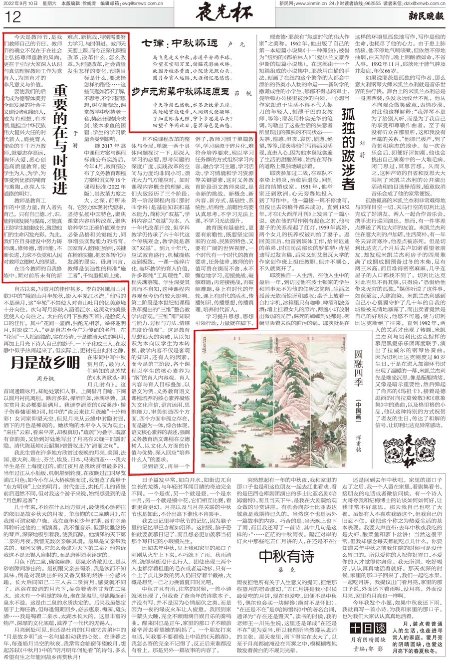 于漪老师为新民晚报夜光杯撰文《重要的在与时俱进》刊于2022年9月10日夜光杯