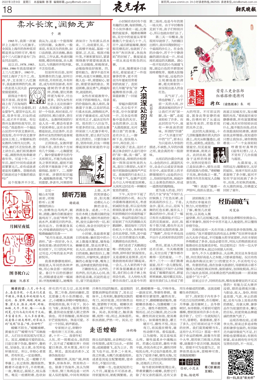 于漪老师为新民晚报夜光杯撰文《柔水长流,润物无声》刊于2022年3月9日夜光杯