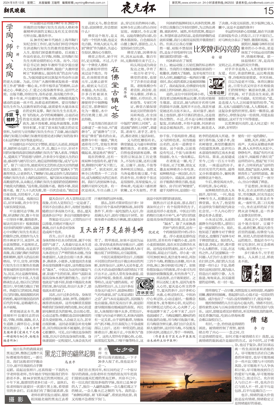 于漪老师为新民晚报“夜光杯”撰写的最后一篇文章《学陶、师陶、践陶》,刊发于2024年8月13日