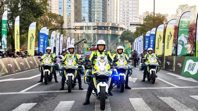 比赛中,由普陀公安分局特警支队民警组成的自行车骑行小队全程分段伴随,沿途骑行护送参赛选手,确保安保工作全覆盖。交管支队的铁骑则在赛事周边道路开展巡逻,加强交通秩序管控。