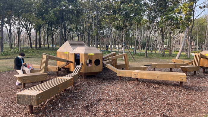 徐汇区绿化管理中心郭玫君介绍,园内核心区域的3公顷绿地,以“森林下面有什么”为故事线,布局了一系列带有本地昆虫元素的可参与景观装置,让孩子在玩乐中认识自然。比如,公园的“躺椅”,用的就是千足虫的造型;“蜘蛛休息站”内,伸出的木质“长脚”就是一条“长椅”,镂空的“身体”内部空间则方便孩童去玩耍探索。