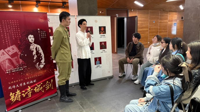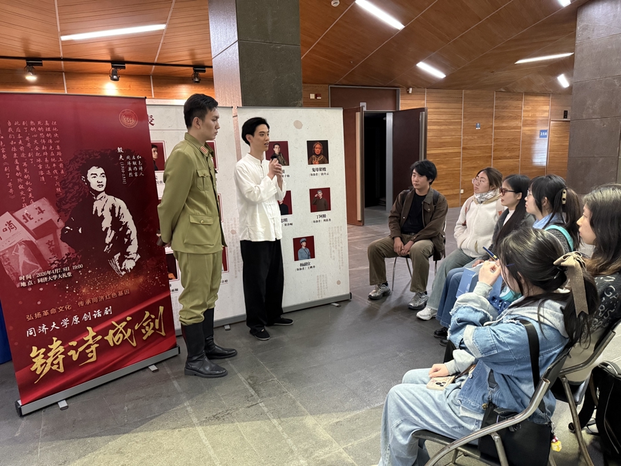 为纪念中国左翼作家联盟成立96周年暨“左联五烈士”牺牲95周年,4月7日,夜光杯·左联·青年写作计划第三季系列活动今年第二次走进了上海同济大学。活动特别邀请了中国上海国际艺术节学生观演团的大学生,与同济师生、社区居民共同观看了由同济大学学生倾情演绎的原创话剧《铸诗成剑》。《铸诗成剑》是“同济校史三部曲”之一的英烈剧,该剧以“左联五烈士”之一、同济大学杰出校友殷夫烈士的革命生涯为主线,艺术再现了殷夫从一位文学青年成长为坚定的无产阶级革命战士的壮丽人生。演出结束后,观演团大学生与剧组成员展开了一场热烈而真挚的交流。