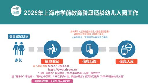 2022年9月1日至2023年8月31日出生的申城萌娃家庭请定好闹钟,入园工作正式启动了,4月22日起进行网上信息登记!今天下午,上海市教委正式发布《关于做好2026年上海市学前教育阶段适龄幼儿入园工作的通知》,今年本市幼儿入园工作坚持统一部署、规范程序和因地制宜的原则,继续通过“一网通办”平台进行,整体流程与往年保持总体一致。