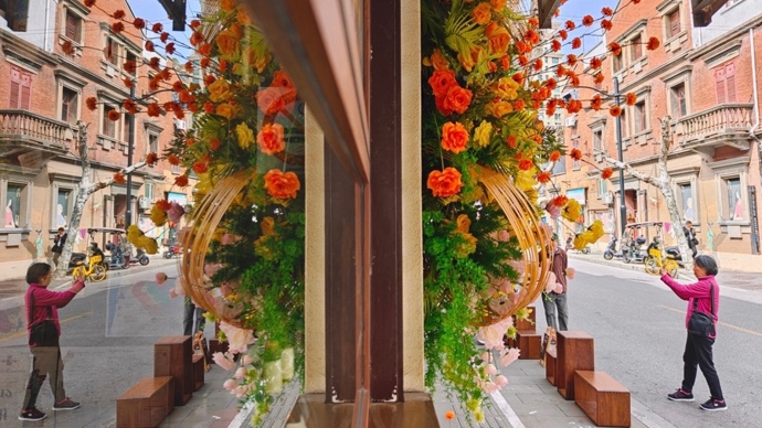 春日花街 | 花瀑垂门,花境铺巷,花枝绕窗……随着2026上海国际花卉节临近,黄浦区淡水路已完成春日花卉布置。市民闲庭信步、赏花寻香或驻足沿街小店,感受历史街区的诗意更新与社区活力 新民晚报记者 刘歆 摄