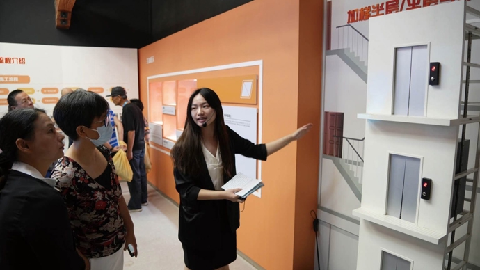 上图:上海市普陀区老旧小区加装电梯现场会工作人员向居民代表介绍加装电梯一系列知识。摄影/张龙