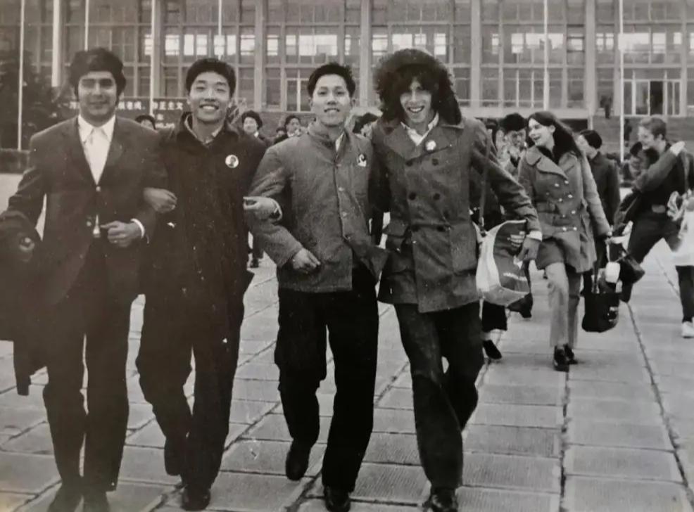 1971年4月15日,美国乒乓球代表团成员格伦·科恩(右一)、埃罗尔·雷塞克(左一)与上海乒乓球队运动员姚振绪(右二)、吴新民(左二)合影。新华社 图