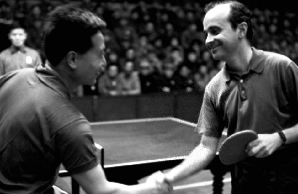 1971年4月15日,曾在第25届世乒赛中相遇的中国运动员杨瑞华(左)和美国运动员迪克·迈尔斯在上海重逢,他们在友谊赛前热情握手。新华社 图