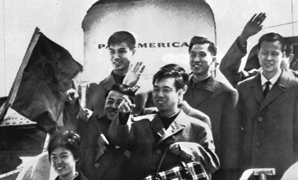 1972年4月13日,中国乒乓球代表团飞抵底特律,对美国进行回访。新华社 图