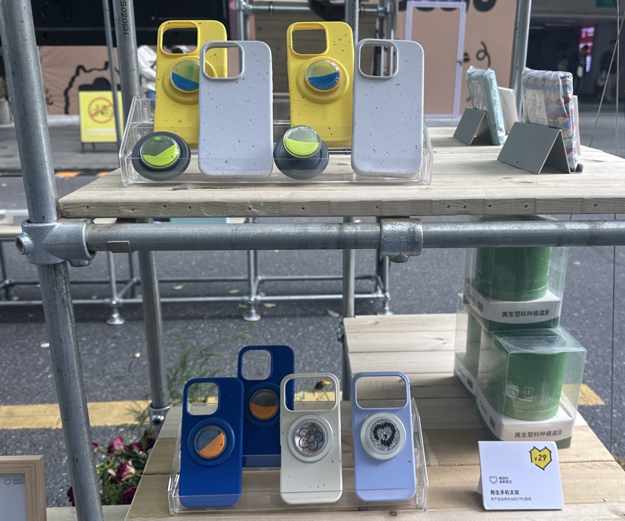 现场,设置了“返航新生-新生之美”展区,通过巨型地球艺术装置、脚手架展陈空间、再生产品展示区及互动打卡点,呈现“回收→再生→新生”的价值闭环。市集上还有“新生之美”系列再生产品,包括再生PET收纳包、再生材质手机壳、磁吸支架等产品均由废弃物再生制成。爱回收品牌中心负责人江文华介绍,企业每年回收废弃物近百万吨,其中相当一部分以循环制品、循环设施、循环装置的方式重新回归日常生活。
