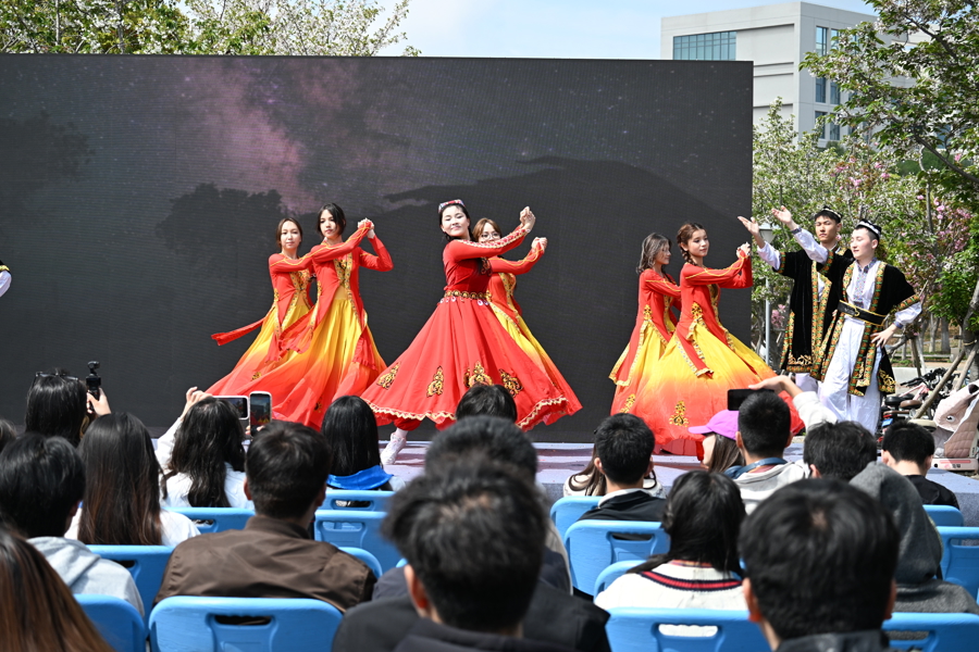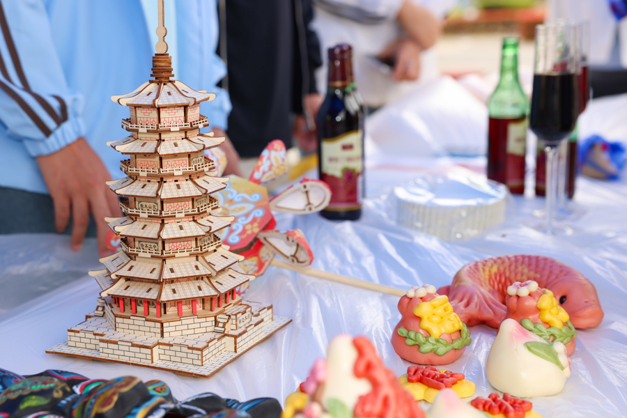 非遗集市在樱花大道火热展开。南湖摊位前,粽子与非遗尺糕香气四溢,菱画技艺传承人指导师生提笔勾勒,文旅宣传材料被争相领取;泉州摊位旁,芋泥饼地道可口,簪花围体验区排起长队,安溪茶道尽显闽南匠心。各省学生摊位依次排开,来自天南海北的美食、民俗、手工艺琳琅满目——从内蒙古的奶制品到广西的螺蛳粉,从云南的云腿月饼到东三省的锅包肉,师生穿行其间,边尝边聊,笑语不断。