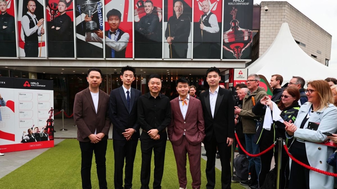 4月17日,中国选手肖国栋、吴宜泽、丁俊晖、赵心童和斯佳辉(由左至右)出席媒体日活动。