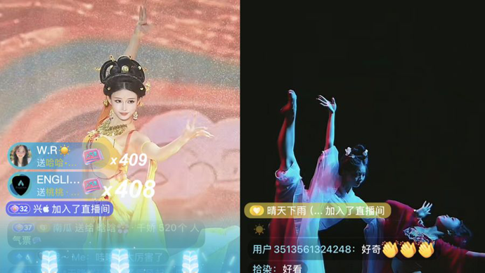以陕西省歌舞剧院为代表的院团团播,特点则在于以专业歌舞体现地方文化。该院团2025年6月入驻抖音,开播仅一个月,单场直播观看人次即超过210万。编导团队将极具唐文化色彩的代表性剧目《仿唐乐舞》拆解重组,改编为适配竖屏画面的直播版本,并大胆融入《霍元甲》等流行元素,形成以唐文化为特色的团播模式。“一场直播的潜在触达人数,按线下的体量等于把一年的演出都演完了。”陕西省歌舞剧院院长孟丁介绍。